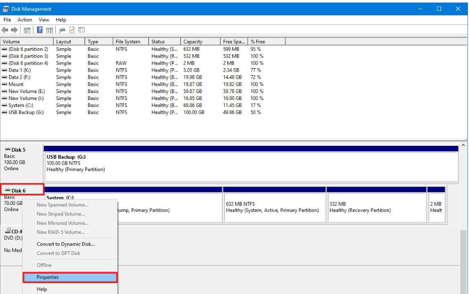 • التحقق من إدارة الأقراص (Disk Management) والتأكد من عدم وجود قسم فارغ بحجم 2MB RAW، وفي حال وجوده يُفضّل حذفه قبل متابعة الخطوات.
