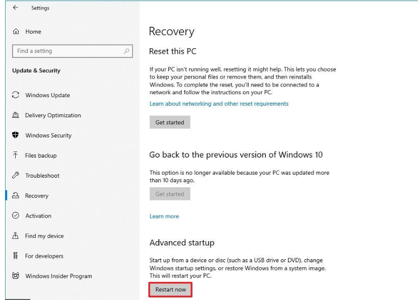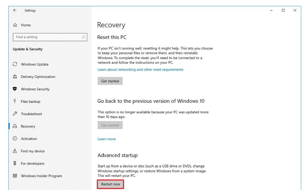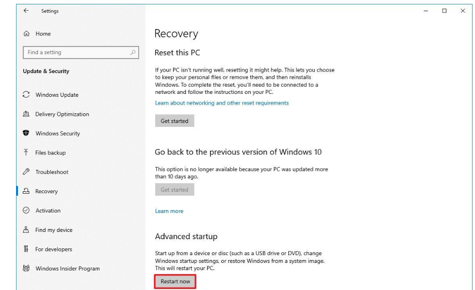Settings → Update & Security → Recovery → Advanced startup → Restart now.