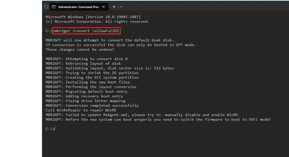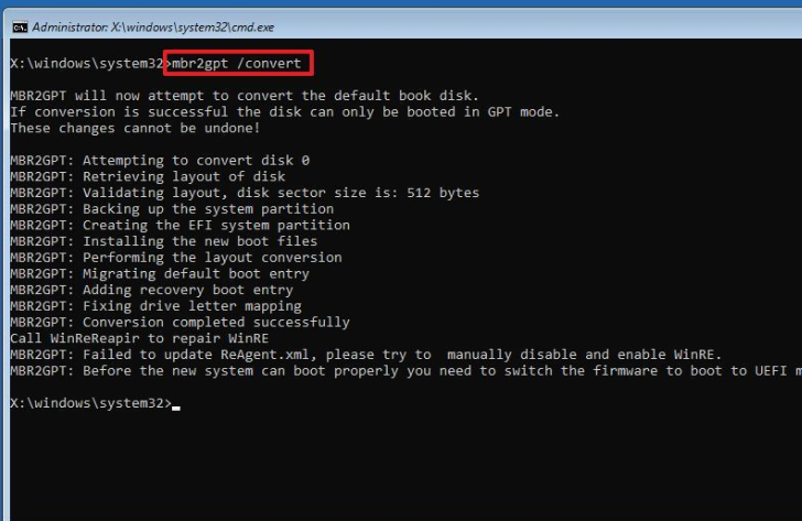 💡 ملاحظة سريعة: النتيجة الظاهرة في الصورة الخاصة بالأمر تشير إلى أن عملية التحويل تمت بنجاح، لكن حدثت مشكلة في بيئة استرداد ويندوز (Windows Recovery Environment – WinRE). في هذه الحالة، وبعد الدخول إلى سطح المكتب، يمكنك تشغيل الأوامر التالية في موجّه الأوامر (Command Prompt) مع صلاحيات المسؤول (Admin) لحل المشكلة: